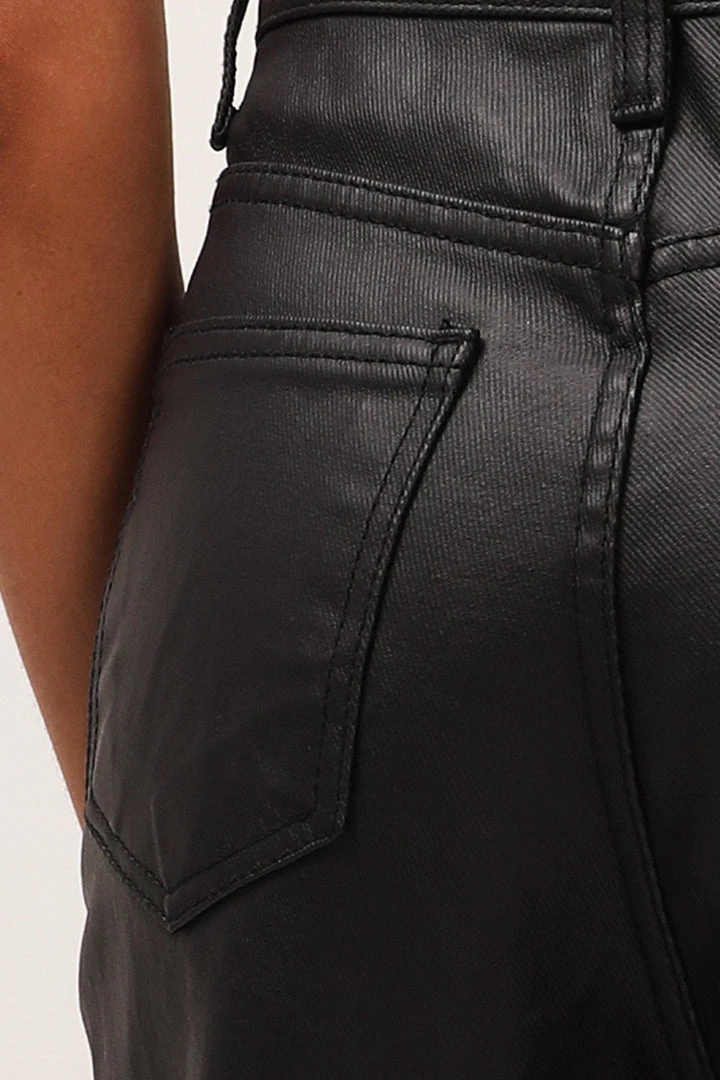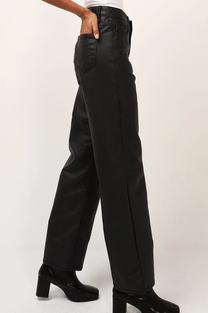 - Featuring a faux-leather look coated material all over, a high waist silhouette, a straight leg-fit silhouette, a full length fit, and a zip fly closure at front