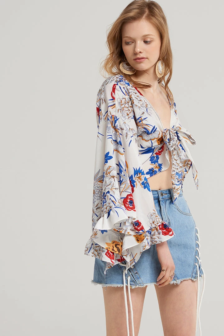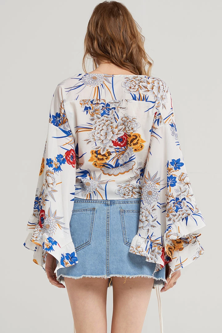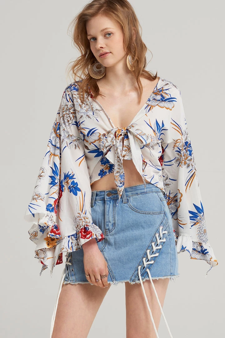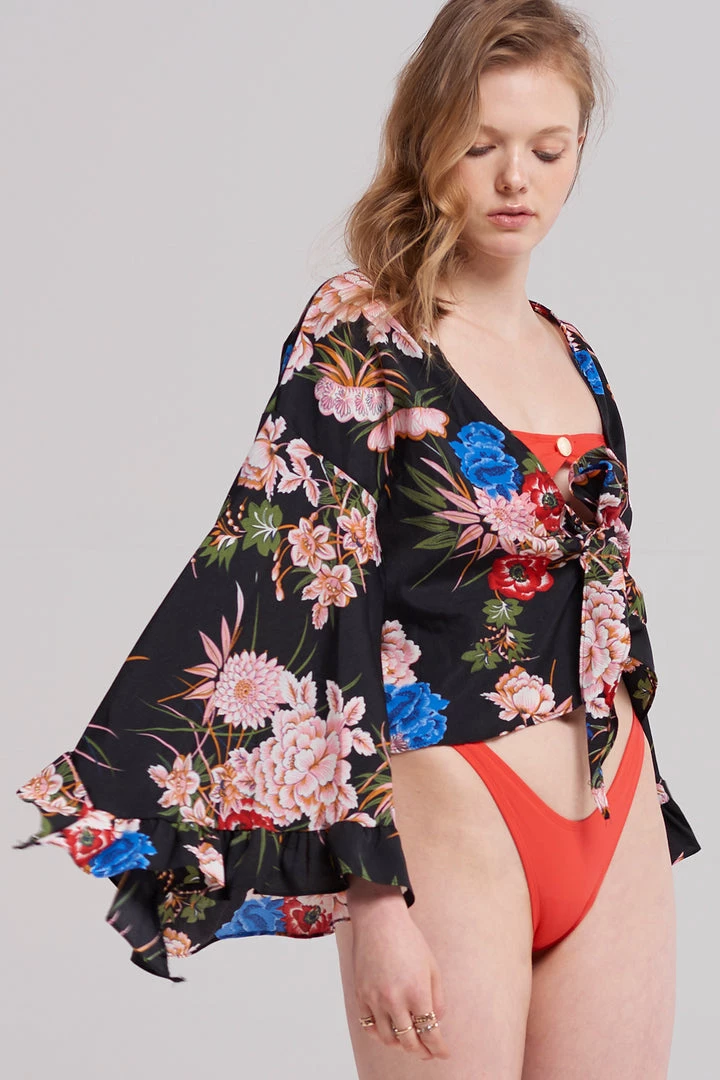 Cobalt blue is the highlight of this wide bell sleeved top with soft frill hem. Play around with the wrap creating various looks for your beach sunny day. * Product Specification Polyester 100% * Flat Measurement S/M: Shoulder: 59??(23.2in) / Bust: 48??(18.9in) Length: 42.5??(16.7in) / Sleeve: 37??(14.6in) * Professional Clean Only Model’s height is 5’7″ (174cm) and wearing S/M