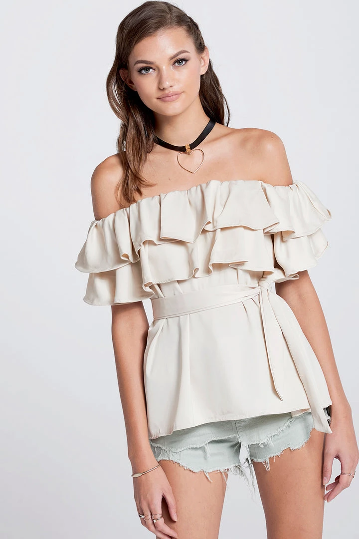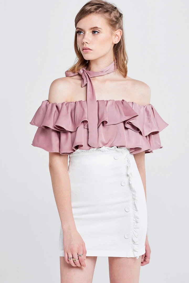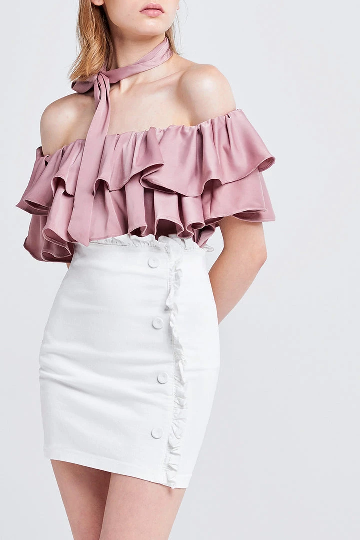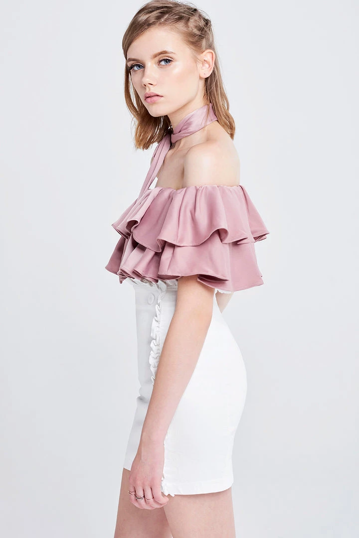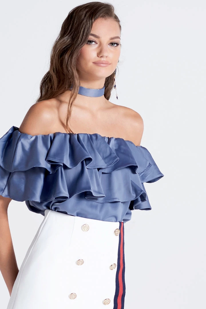This off the shoulder top is absolutely stunning. It?â„¢s made with a smooth satiny fabric, arranged in ruffles that fall whimsically all over the chest. It comes with a wide belt, which we folded in half and tied around the neck to transform it into a choker.