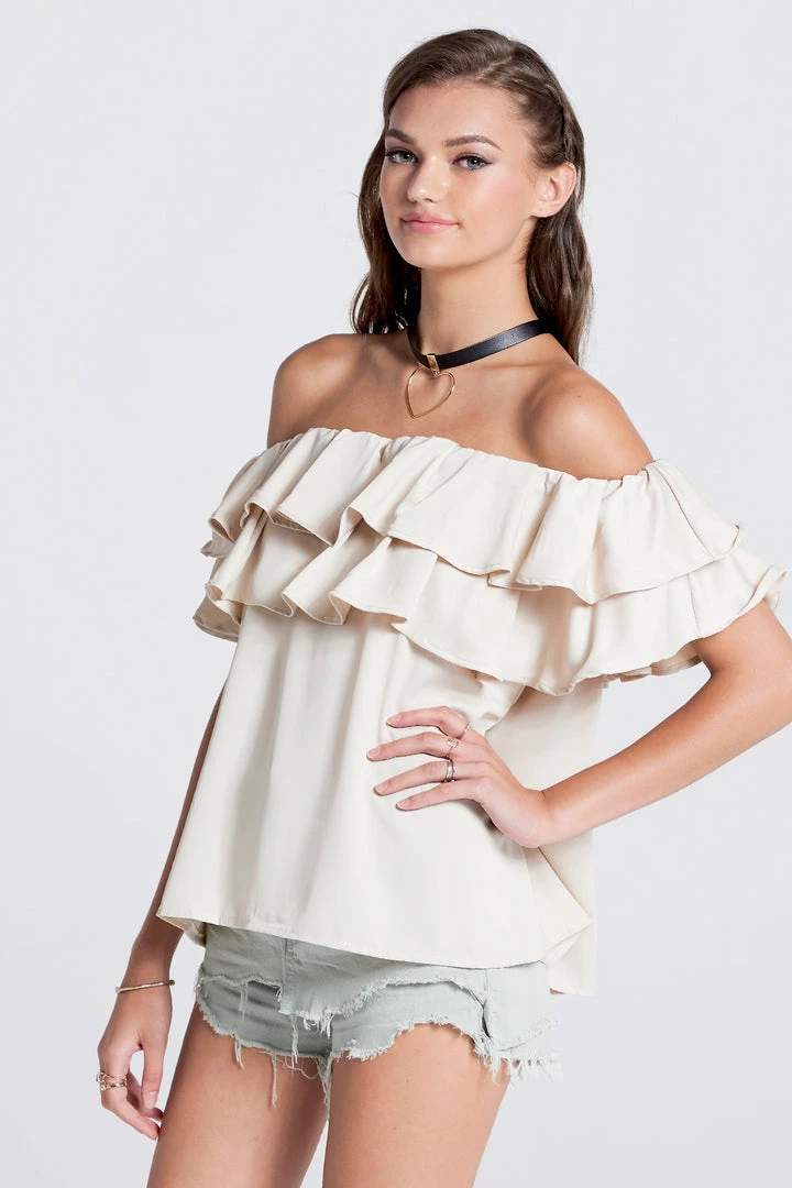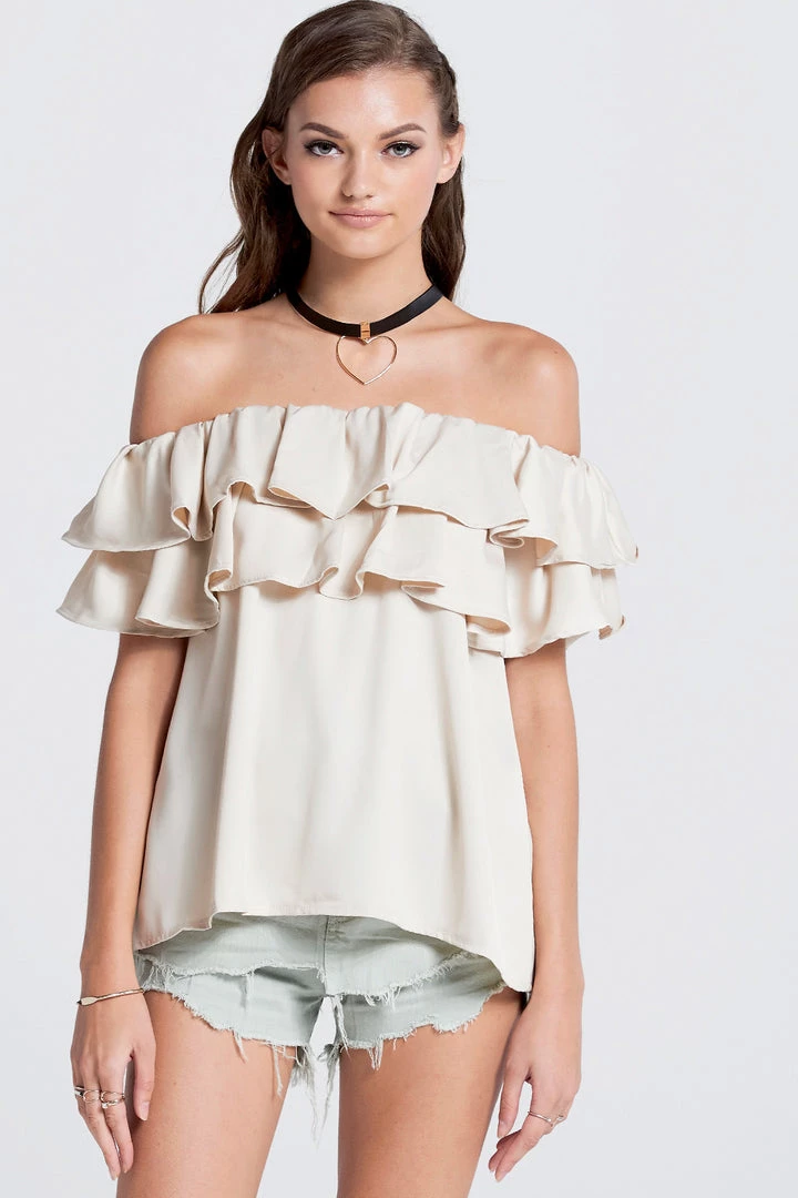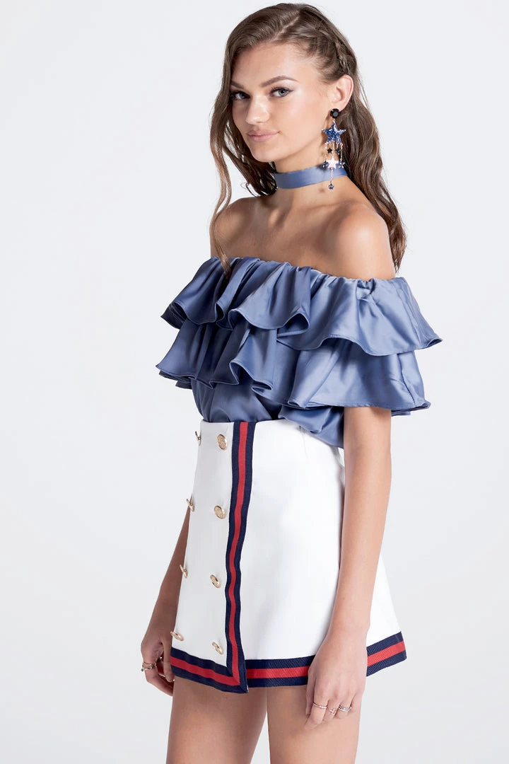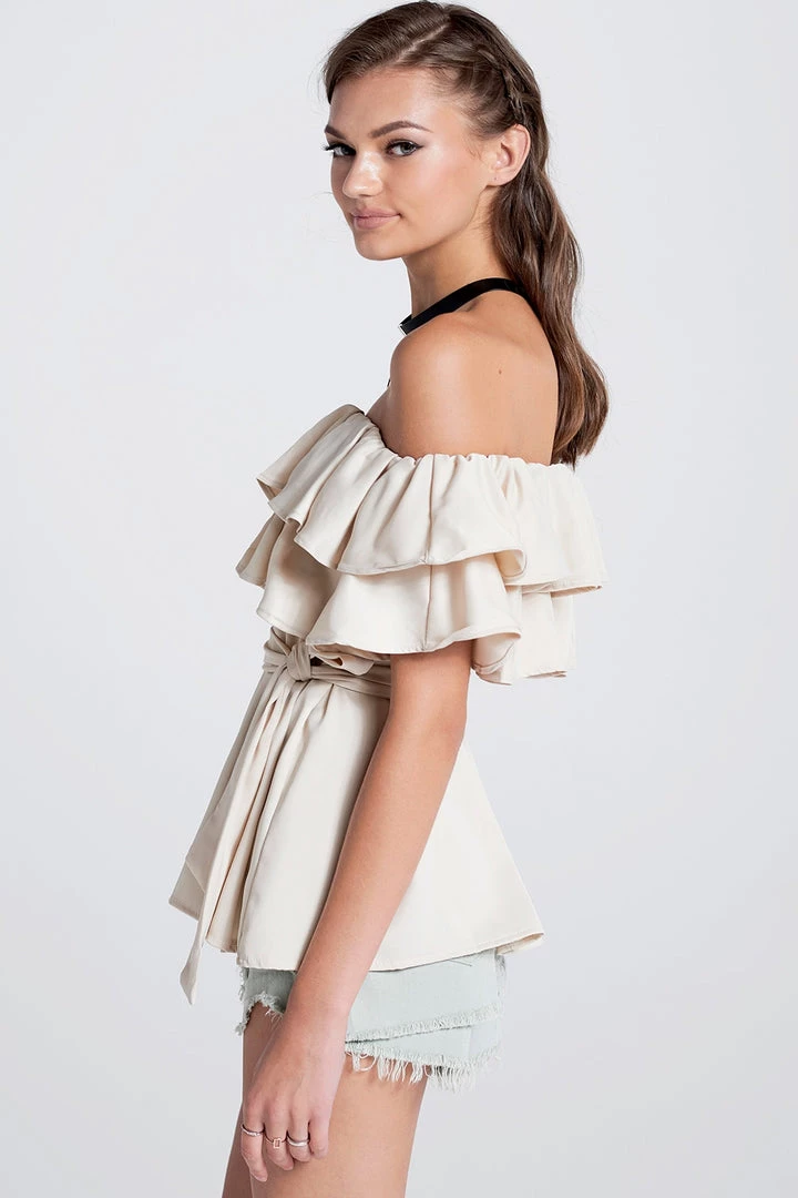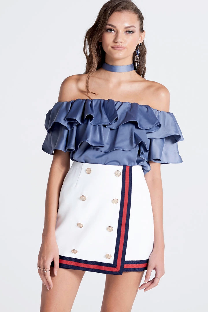 This off the shoulder top is absolutely stunning. It?â„¢s made with a smooth satiny fabric, arranged in ruffles that fall whimsically all over the chest. It comes with a wide belt, which we folded in half and tied around the neck to transform it into a choker.