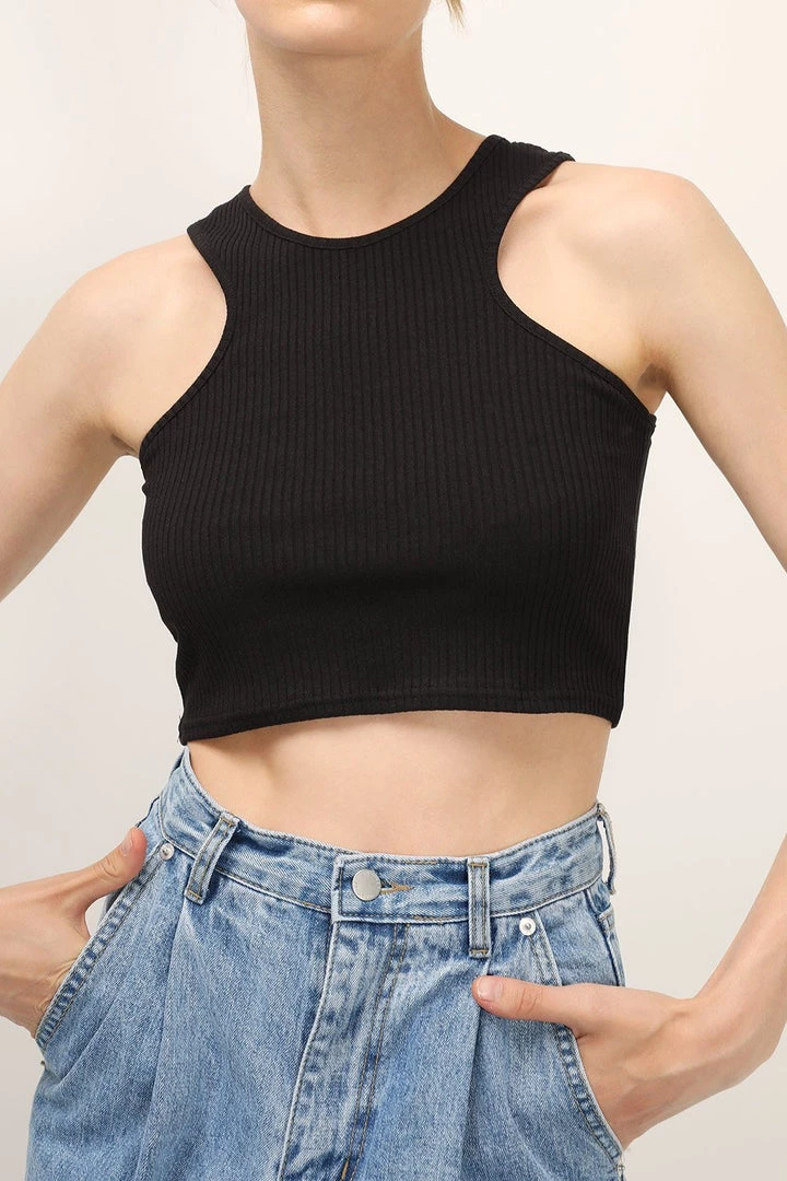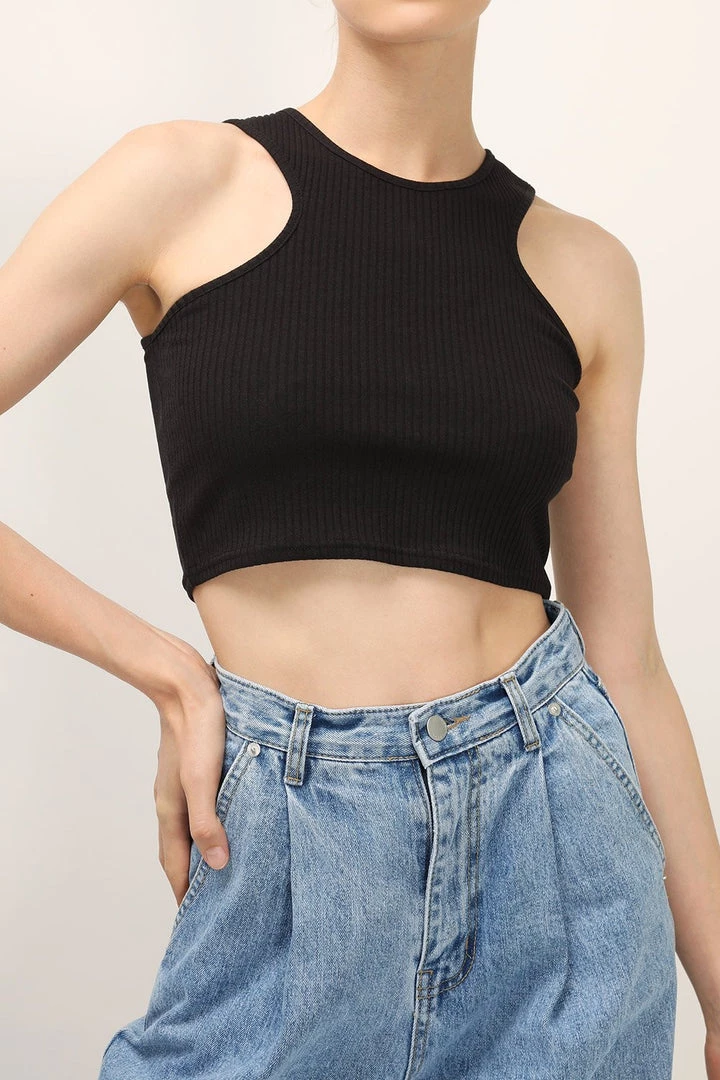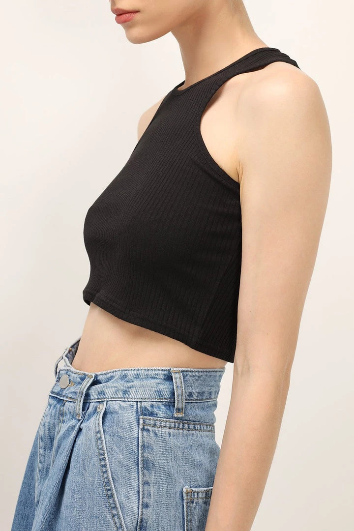 - This top features a ribbed material all over, a cropped length silhouette, a deep cutting armhole design, a fitted, and pull on style