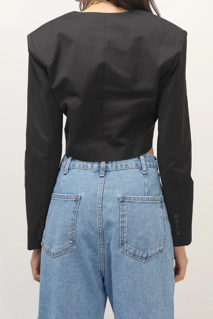- This jacket features a cropped length silhouette, a padded shoulder detail, a collarless neckline, and button closures at front