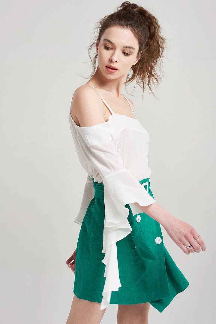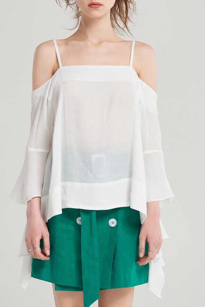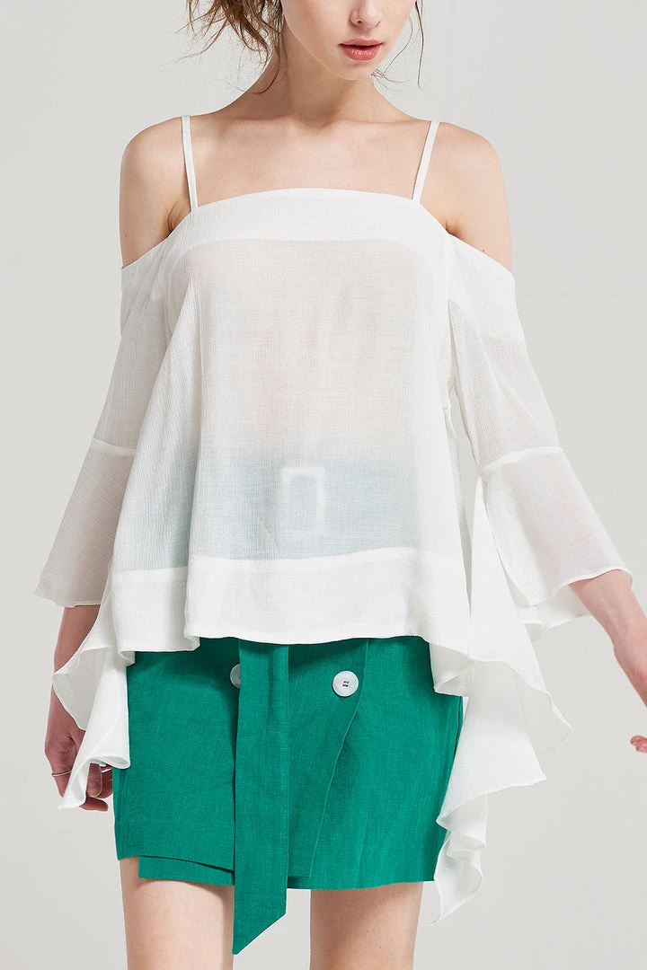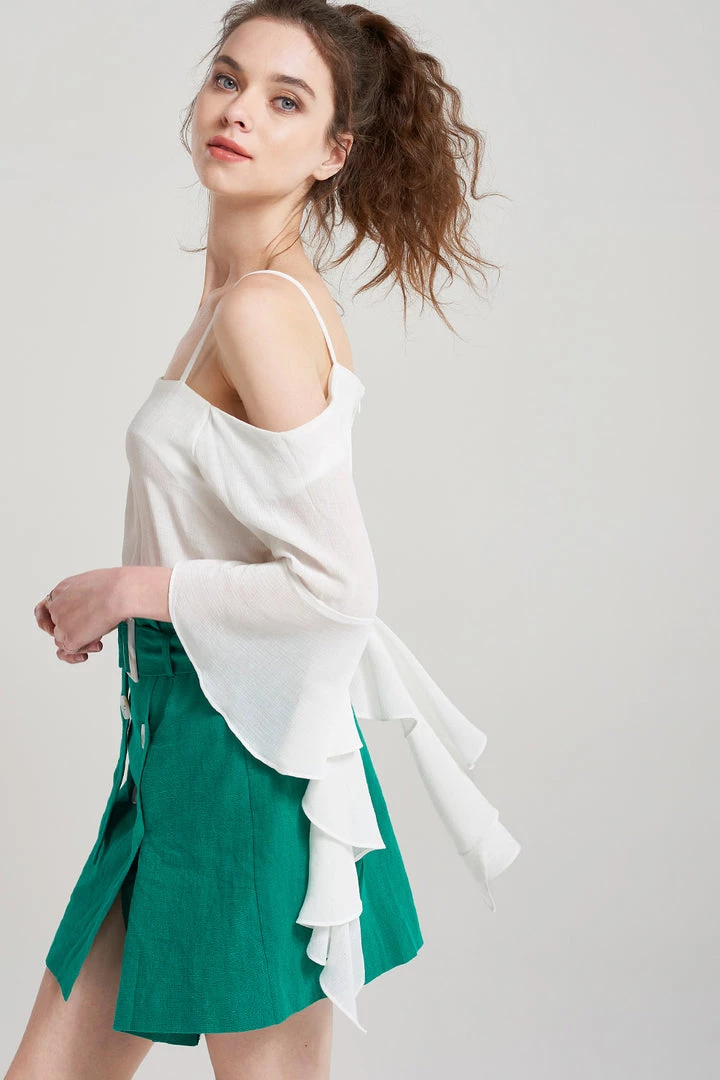 Semi-linen top with thin string strap and rippling sleeves. Go for a princess mood with this cute outfit.
