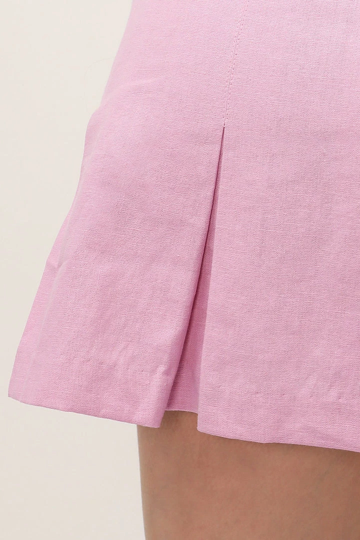 - This skirt features a linen blended material all over, a pleated hem detail, a belt tab detail at side, a mini length silhouette, and a concealed zipper closure at side
