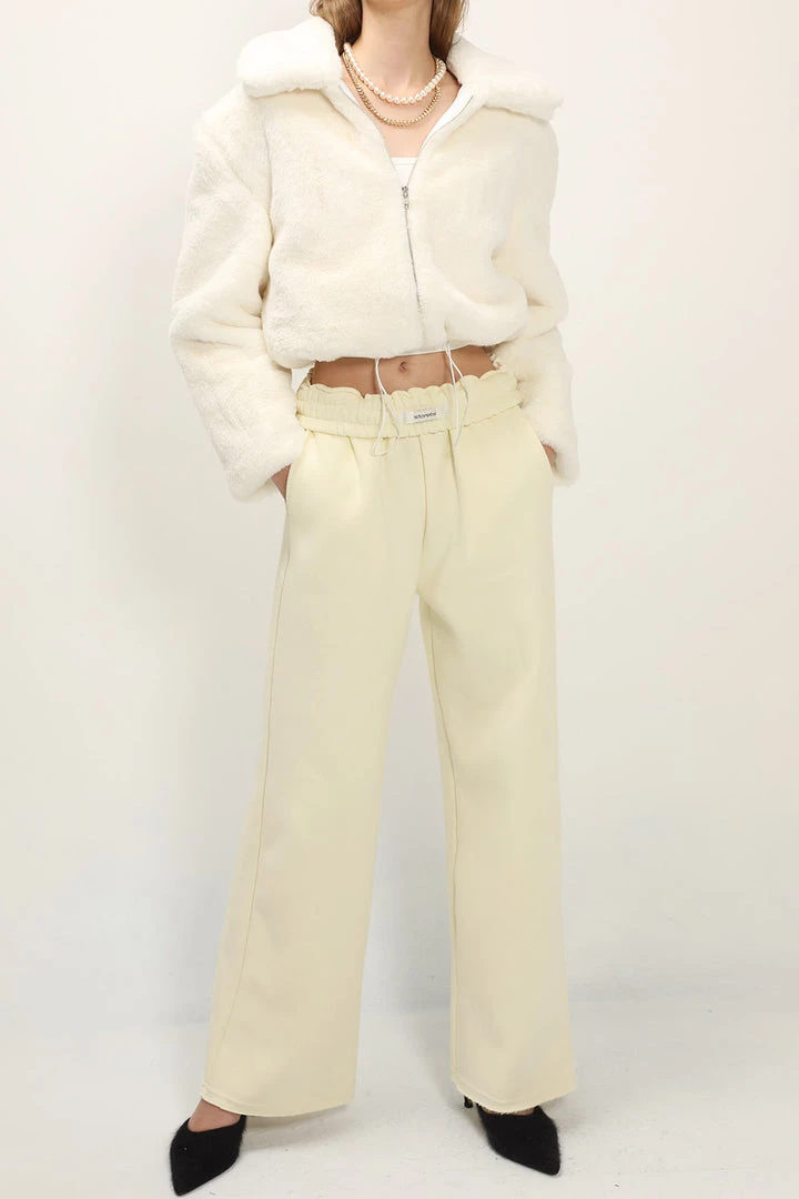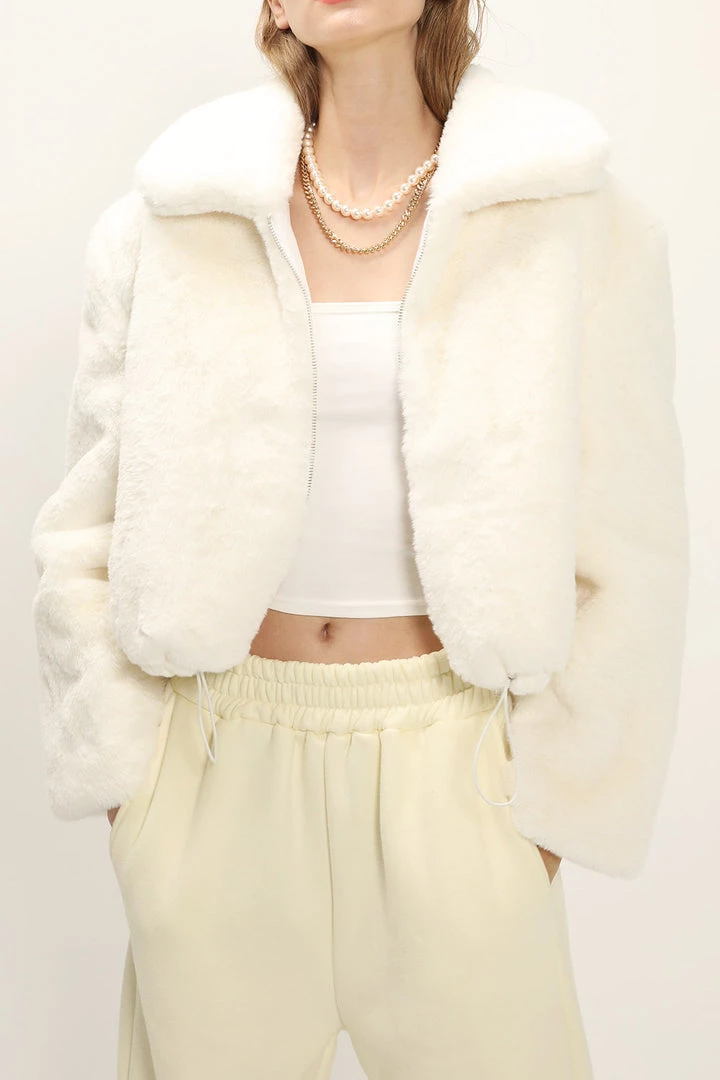 - This faux-fur jacket features a fluffy artificial fur material all over, a wide collar detail, a drawstring detail at waist, a cropped length silhouette, and a zipper closure at front