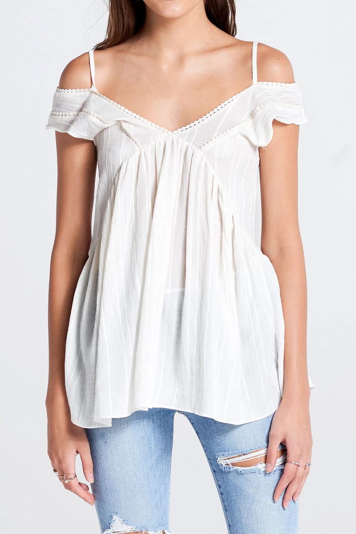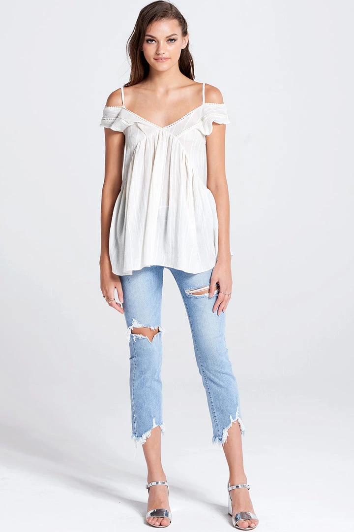 This coldshoulder blouse has such a sweet look. The sleeves fall gracefully below the shoulders and are lined with dainty lace. Style with a colorful robe and a pair of light wash jeans to complete the look.