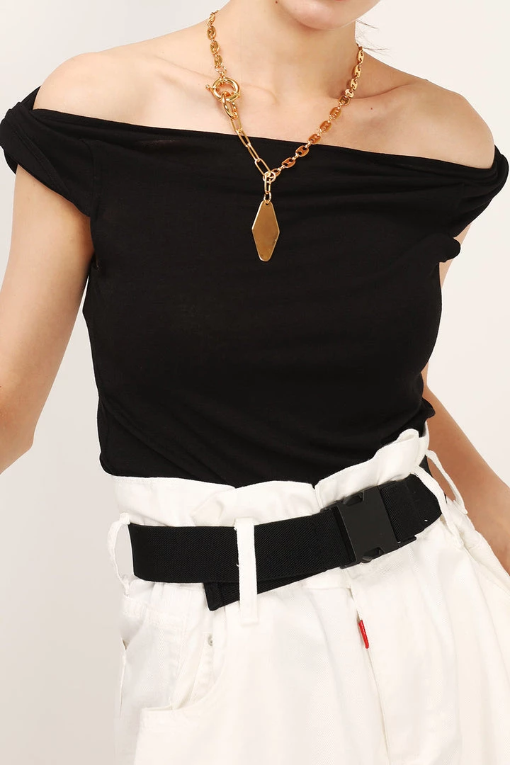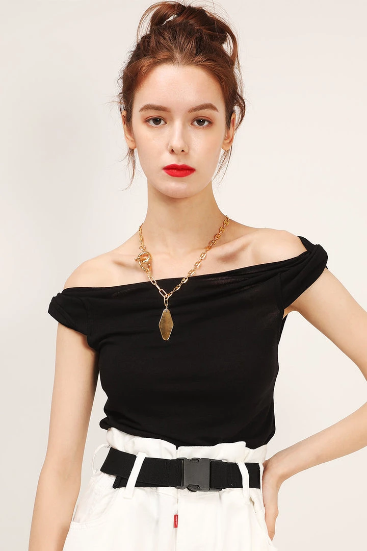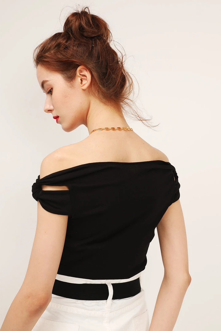 - This top features an off-the-shoulder design, a twist detail at shoulder, a fitted silhouette, and pull on style