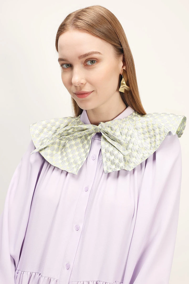 - Accented with a frilled cape at neck with a self-tie ribbon detail