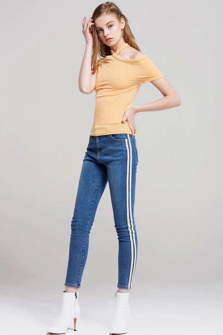 In cropped skinny fit, the jeans feature double side stripes. It smartly fools one’s eye giving a slimmer, taller impression when worn. * Product Specification Cotton 98% Spandex 2% * Flat Measurement xs: Waist: 33??(13in) / Length: 89??(35in) * Professional Clean Only Model’s height is 5’7″ (174cm) and wearing S