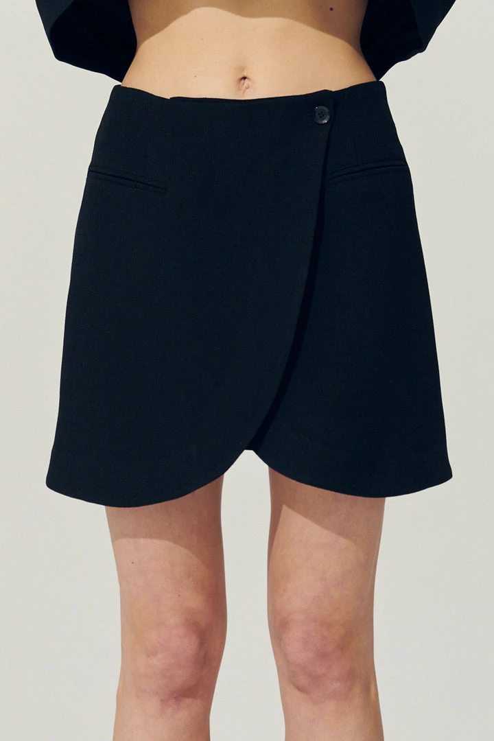 - Easy-wear wrap skirt. A classic tulip shape mini skirt accentuates your waist and is a true wardrobe must-have. This skirt features a front button closure, pocket details, full lined.