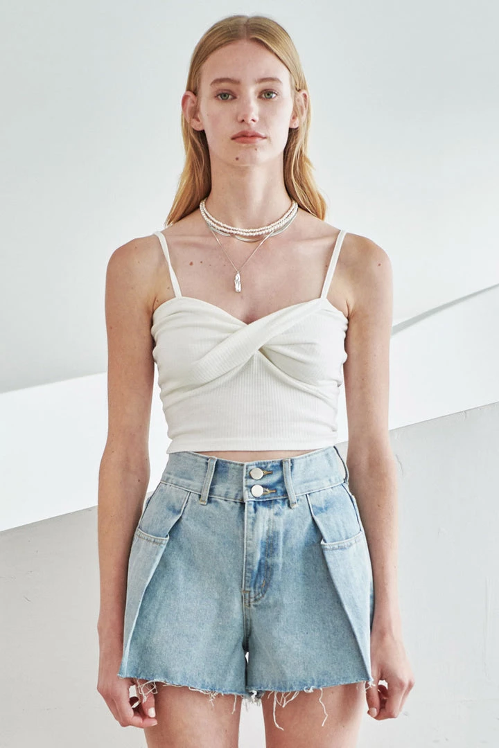 - Top: Sleeveless, front twist detail, crop length